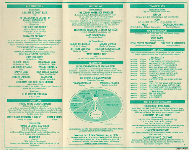 This page shows the epic amount of live entertainment offered at Disneyland. The bland named “THE CHRISTMAS PARADE” was still running at this point. It was finally replaced in 1994 by the still-running Christmas Fantasy Parade. I also noticed something which I never knew, the Golden Horseshoe used to take reservations. It just shows how popular and loved that show was.