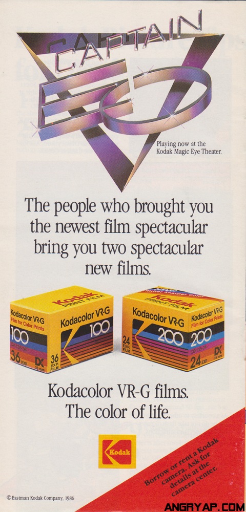 This map from late 1986 Disneyland map prominently features the Kodak logo on the front of the cover. The rear cover features a dual advertisement for Captain EO (a Kodak-sponsored attraction), and the their new Kodacolor VR-G 100 and 200 films. Both of which were introduced in 1986. The Kodak stock price at the end of 1986 was $69 a share.